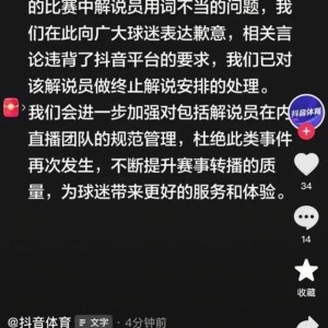 13 01月 2026 29 CBA官方解说出现争议言论!抖音体育深夜致歉 1月7日深夜,抖音体育在官方账号发文称,关注到CBA广东队对深圳队的比赛中解说员用词不当的问题,在此向广大球迷表达歉意,... 英超