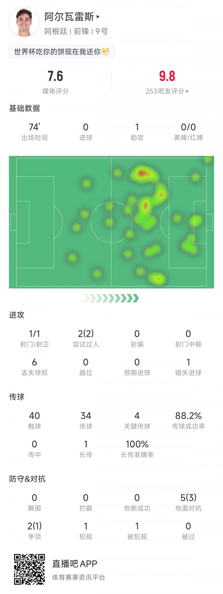 01月 13 2026 0 开云官网-阿尔瓦雷斯全场数据:出战74分钟,1次助攻+4次关键传球 xiaoqiao 2026-01-13 nba 21 9月5日讯 世预赛南美区第17轮,阿根廷对阵委内瑞拉。本场比赛,阿尔瓦雷斯出战74分钟,1次射门1次射正,送出1次助攻,2次过人,错失1粒进球,4次关键传球,传球成功率88.2%,5次地面对抗3次成功,2次争顶1次成功。
