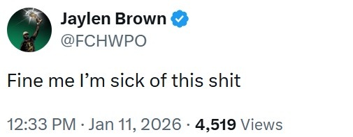 01月 17 2026 0 开云官网-我要正义!杰伦·布朗公开喊话:罚我款吧 我早就受够了这些破事 xiaoqiao 2026-01-17 德甲 31 1月11日讯 NBA常规赛,凯尔特人95-100不敌马刺。本场比赛,罚球数凯尔特人4-20马刺,对此,杰伦·布朗说道:“我会接受TM的罚款,今天判罚的不一致太离谱了,罚我吧!”杰伦·布朗更推喊话道:“罚我款吧,我早就受够了这些破事。”